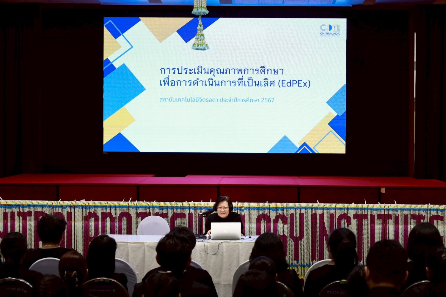 รศ.ดร.คุณหญิงสุมณฑา พรหมบุญ ชี้แจงทิศทางการดำเนินงานของสถาบันเทคโนโลยีจิตรลดา แนวคิดการดำเนินงาน คุณค่าทางจริยธรรม การปรับวิสัยทัศน์ การปรับปรุงแผนพัฒนาสถาบัน